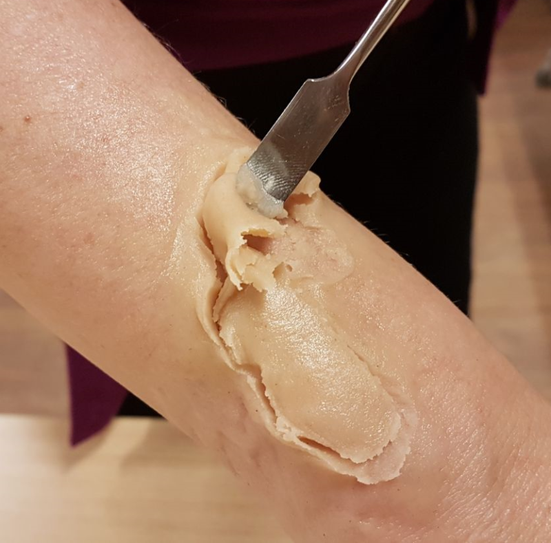 Het blijft wonderlijk dat je een stukje materiaal, of het nu (wax)deeg, modelleer was, gelatine of siliconen is en zodra je er met een spatel in gaat werken dat je al gelijk dat 'auw'-gevoel krijgt.